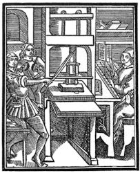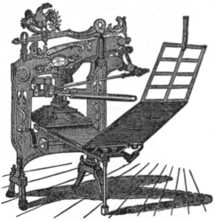 About the year 1450, Gutenberg was engaged in printing his first book from movable types. No method of taking the impressions simpler than that employed by him can be imagined, unless it be with a “buffer,” or by means of a brush rubbed over the paper laid upon the “form” of type, after the manner of the Chinese in printing from engraved blocks. His printing press consisted of two upright timbers, with cross pieces of wood to stay them together at the top and bottom. There were also intermediate cross timbers, one of which supported the flat “bed” upon which the type was placed, and through another a wooden screw passed, its lower point resting on the centre of a wooden “platen,” which was thus screwed down upon the type. After inking the form with a ball of leather stuffed with wool, the printer spread the paper over it, laying a piece of blanket upon the paper to soften the impression of the platen and remove inequalities. This was the machine which Gutenberg used. The mechanical principle embodied in it was found in the old cheese and linen presses ordinarily seen in the houses of medieval times.