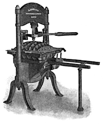 The first recorded improvements in this press were made by William Jensen Blaew, a printer of Amsterdam, some time about 1620. They consisted in passing the spindle of the screw through a square block which was guided in the wooden frame, and from this block the platen was suspended by wires or cords; the block, or box, preventing any twist in the platen, and insuring a more equal motion to the screw. He also placed a device upon the press for rolling in and out the bed, and added a new form of iron hand lever for turning the screw. Blaew’s press was introduced into England, and used there as well as on the continent, being substantially the [7] same as that Benjamin Franklin worked upon as a journeyman in London, early in the last century.