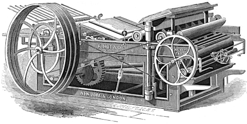 Hoe & Co. had previously made the first flat bed and cylinder press ever used in the United States. It was the pattern known as the “Single Large Cylinder,” the whole circumference of the cylinder being equivalent to the entire travel of the bed forwards and backwards, the cylinder making one revolution for each impression in printing, without stopping. Only a portion of the cylinder was employed to take the impression, the remainder of its circumference being [20] turned down small enough to allow the type on the bed to pass back under it without touching. Hundreds of these machines were made and are now in use, and they are still made at the present day, with patented sheet fliers and other devices and improvements in the methods of manufacture. Other similar presses were made later by the press-makers A. B. Taylor, A. Campbell, C. B. Cottrell, and C. Potter, Jr.