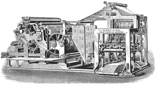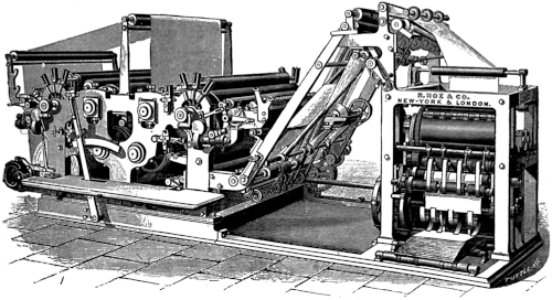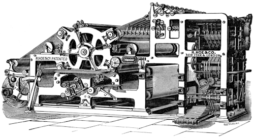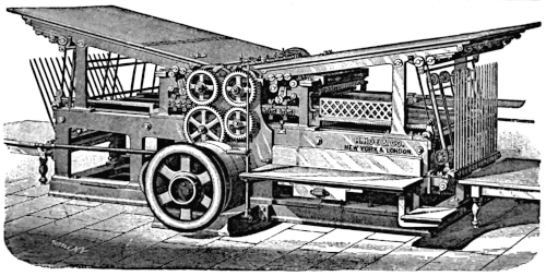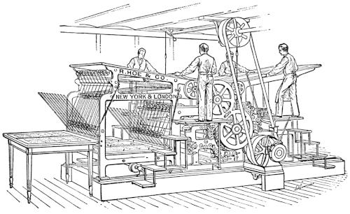 The news of these later inventions reached New York in due time, and in 1832 Robert Hoe, who had been some time established [18] in the manufacture of printing presses, sent a young man, Sereno Newton (whom he afterwards took in partnership with him), to England to investigate the subject and see what improvements were worthy of adoption. The result was the construction of the [19] machines known as the “Single Small Cylinder” and “Double Small Cylinder,” also the large Cylinder “Perfecting” Press, which have continued, with many alterations and improvements, to be manufactured up to the present time.