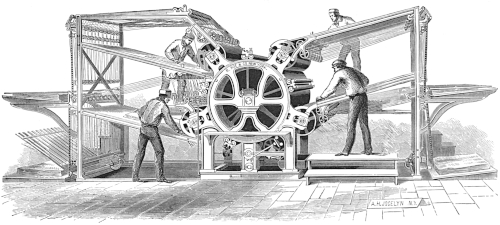 Before proceeding further with an account of the faster newspaper presses, it may be well to complete the history of machines employed up to this time for book, job and woodcut printing. For this purpose the “Single Large Cylinder,” already described, was first used. In England there were the “Napier” presses, the “Wharfdale” and many others, all involving the same general principle, and capable of turning out more or less satisfactory work, in proportion to the perfection of their construction and the skill of those operating them. Most of the English machines, however, show defects in mechanical construction. In fact, the supremacy of the American printing press is maintained in a large measure by the simplicity, accuracy and perfection of its mechanism. Foreign presses, made by the cheap labor of Europe, have been repeatedly brought to this country and introduced into printing offices. They have never, however, lasted long, most of them having perished in the using or been found unprofitable.