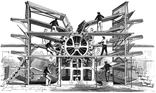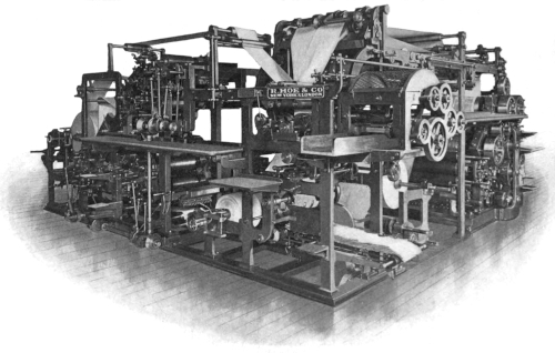 Marinoni, of Paris, also devised a machine on a similar principle, making the impression and the form cylinder of one size, and placed them one above the other. The “Marinoni” machine had separate fly boards for the delivery of the sheets.