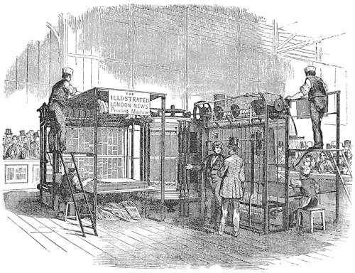 In the meantime various experiments had demonstrated the possibility of casting stereotype plates on a curve. The process was brought to perfection by the use of flexible paper matrices, upon which the metal was cast in curved moulds to any circle desired, and these plates were placed upon the Hoe “Type Revolving Machine” upon beds adapted to receive them instead of the type forms. The newspaper publishers were thus enabled to duplicate the forms, and run several machines at the same time with a view of turning out the papers with greater rapidity. In some large offices, such as the New York “Herald,” London “Daily Telegraph,” and the London “Standard,” as many as five of these machines were in constant operation. About this time the stamp duty in England of one penny upon each sheet of printed matter was repealed. This in itself aided materially in the development of the newspaper press.