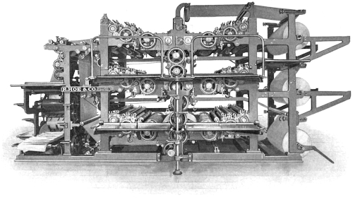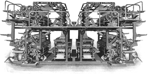 These folders, however, were only the commencement of a long series of experiments undertaken by the makers in the development of still faster printing and folding mechanisms, and from this time forward the progress made has been phenomenal. With great ingenuity, added to long experience, and by the acquisition and adaptation of every device which should aid them in their efforts, Hoe & Co. succeeded in providing machines of unrivalled designs, efficiency and speed.