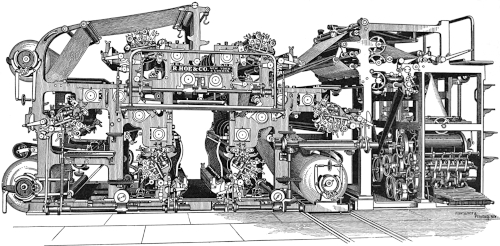 Second. The difficulties in obtaining paper in the roll of uniform perfection and strength. The paper-makers were led to make a study of producing large rolls of paper meeting these requirements, and became much more experienced in its manufacture. The “Walter” press in the “Times” office had necessitated a very strong and expensive paper, which could not be afforded by the cheap daily press.