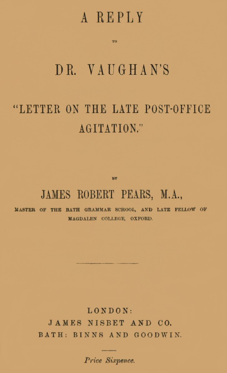 The Project Gutenberg eBook, A Reply to Dr. Vaughan's "Letter on the late Post-Office Agitation", by James Roberts Pears This eBook is for the use of anyone anywhere in the United States and most other parts of the world at no cost and with almost no restrictions whatsoever. You may copy it, give it away or re-use it under the terms of the Project Gutenberg License included with this eBook or online at www.gutenberg.org. If you are not located in the United States, you'll have to check the laws of the country where you are located before using this ebook. Title: A Reply to Dr. Vaughan's "Letter on the late Post-Office Agitation" Author: James Roberts Pears Release Date: November 13, 2020 [eBook #63746] Language: English Character set encoding: ISO-646-US (US-ASCII) ***START OF THE PROJECT GUTENBERG EBOOK A REPLY TO DR. VAUGHAN'S "LETTER ON THE LATE POST-OFFICE AGITATION"***