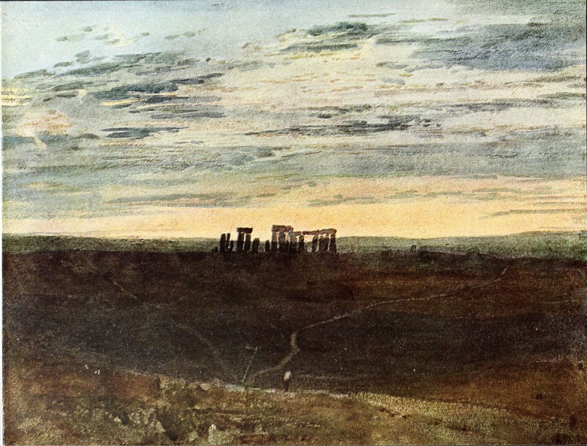 After Turner’s election in 1799 as an Associate of the Royal Academy, he exhibited fewer water-colours and more oil pictures, although he was continually producing drawings, mostly of large size and on commission. For the next few years his style did not greatly alter, although a steady growth in power and range is visible. Several large views of Edinburgh and its neighbourhood, a series of Fonthill commissioned by Beckford, another of Chepstow executed for the Earl of Harewood, together with the Welsh castles of Conway, Carnarvon, St. Donat’s and Pembroke, are among the most important. The Stonehenge reproduced here (Plate VII.) is probably the work of about 1803-1804.