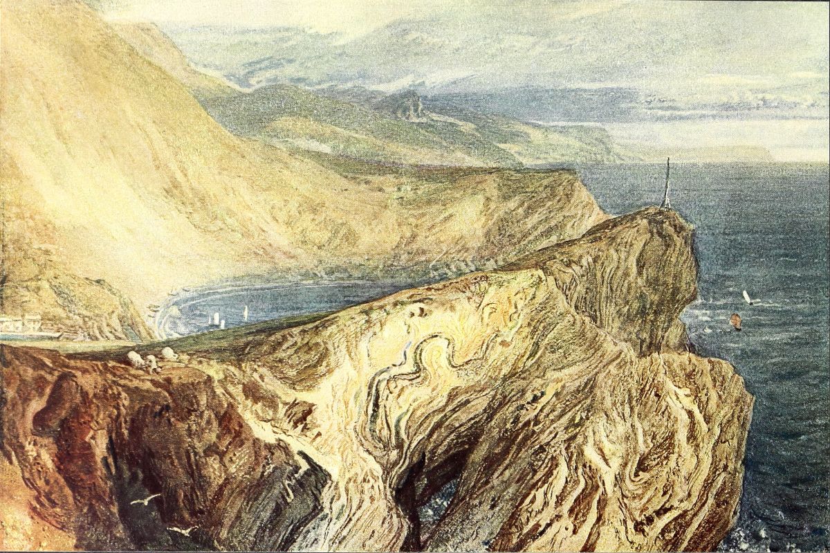 The Southern Coast drawings are elaborate, highly finished, and in a rather warmer tone of colour than hitherto. Many are extremely beautiful, but in some there is visible that crowding of lights and foreground figures, which from this time onwards is not unfrequent in Turner’s work. The majority of the drawings are now, alas, so faded as to give but little idea of their pristine beauty. What they all were like originally, may still be seen in the beautiful Clovelly Bay in the National Gallery of Ireland (Vaughan Bequest), and in the Lulworth Cove reproduced here (Plate IX.).