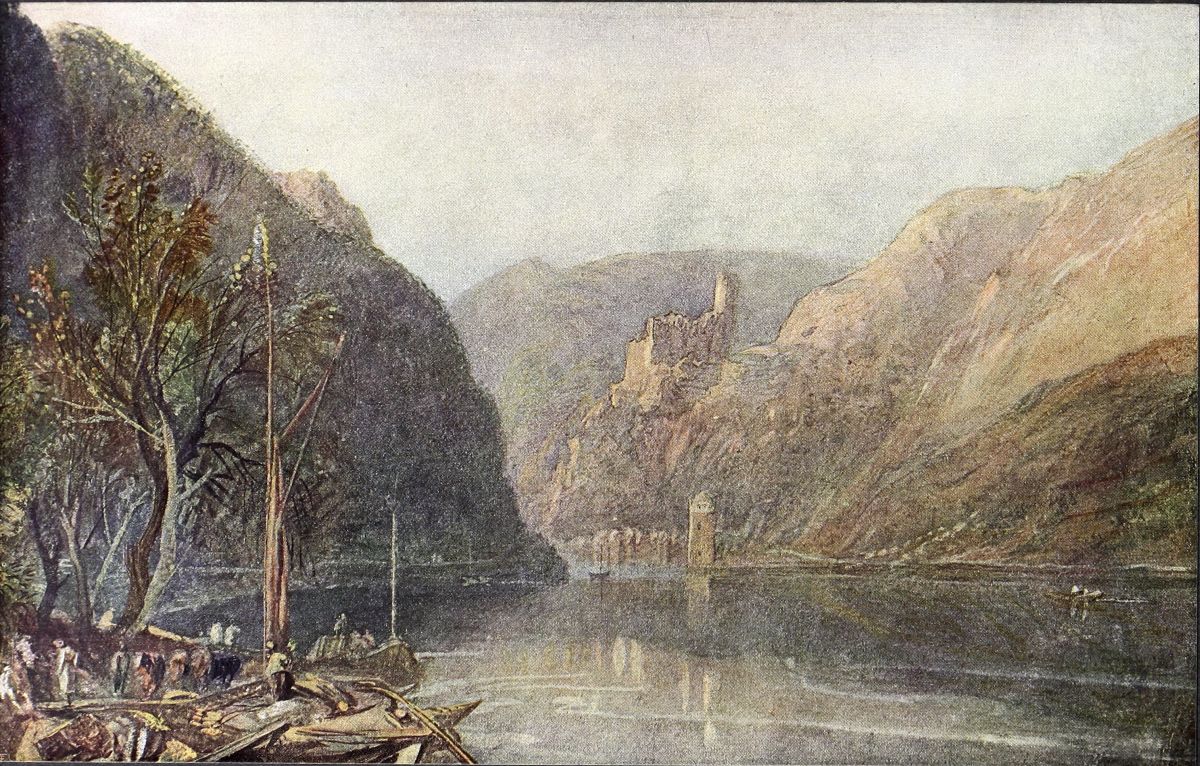 Up to about 1830, Turner’s finished drawings were mainly in transparent water-colour, but from a quite early period he employed body-colour in his sketches, especially whenever speed was necessary. “Body-colour,” it need hardly be said, is ordinary paint mixed with Chinese white or some other opaque white substance in place of water, and is frequently used on a grey or neutral coloured paper, by which means the work is much more rapid. He had recourse to that method on one memorable occasion. In 1817 he went for a three weeks’ tour in the Rhine district, and during that time produced no less than fifty drawings of fair size, i.e., at the rate of about three a day. He first stained the paper a uniform bluish-grey, which, although itself sombre in tone, effectively shows up the body-colour work, and must have effected an immense economy of time as compared with ordinary transparent colour. When he returned to England he took the drawings in a roll straight to Farnley Hall, and Mr. Fawkes, to his delight, bought them at once for £500. For a long time they remained in a portfolio unbroken, one of the treasures of the house, but a few years ago some were dispersed at Christie’s. One of these, Goarhausen and Katz Castle, is reproduced here (Plate X.).