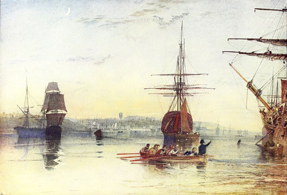 A curious phase in Turner’s work of the next year—1792—merits notice. Influenced probably by the pictures of De Loutherbourg, a French painter, who had settled in England and had been made an R.A., Turner, for a few months entirely changed his scheme of colour, adopting a curious range of greyish and purplish browns as his prevailing tone, in place of the pale greys, blues, and neutral tints, which, in common with the other water-colour painters of the period, he had hitherto employed. In this style are several drawings of Richmond Park, one or two of a fire at the Pantheon, and many of the beautiful scenery on the downs beyond Bristol, where, during his early life, he often stayed with relatives. One, The Mouth of the Avon, is reproduced here (Plate II.). In nearly all the Bristol drawings one special feature is noticeable. Turner had evidently been struck by the unusual spectacle of the masts and sails of the tall East-Indiamen, which were daily to be seen in full sail under the thick woods of the Clifton downs, beating their way up the narrow gorge of the Avon to the port of Bristol.