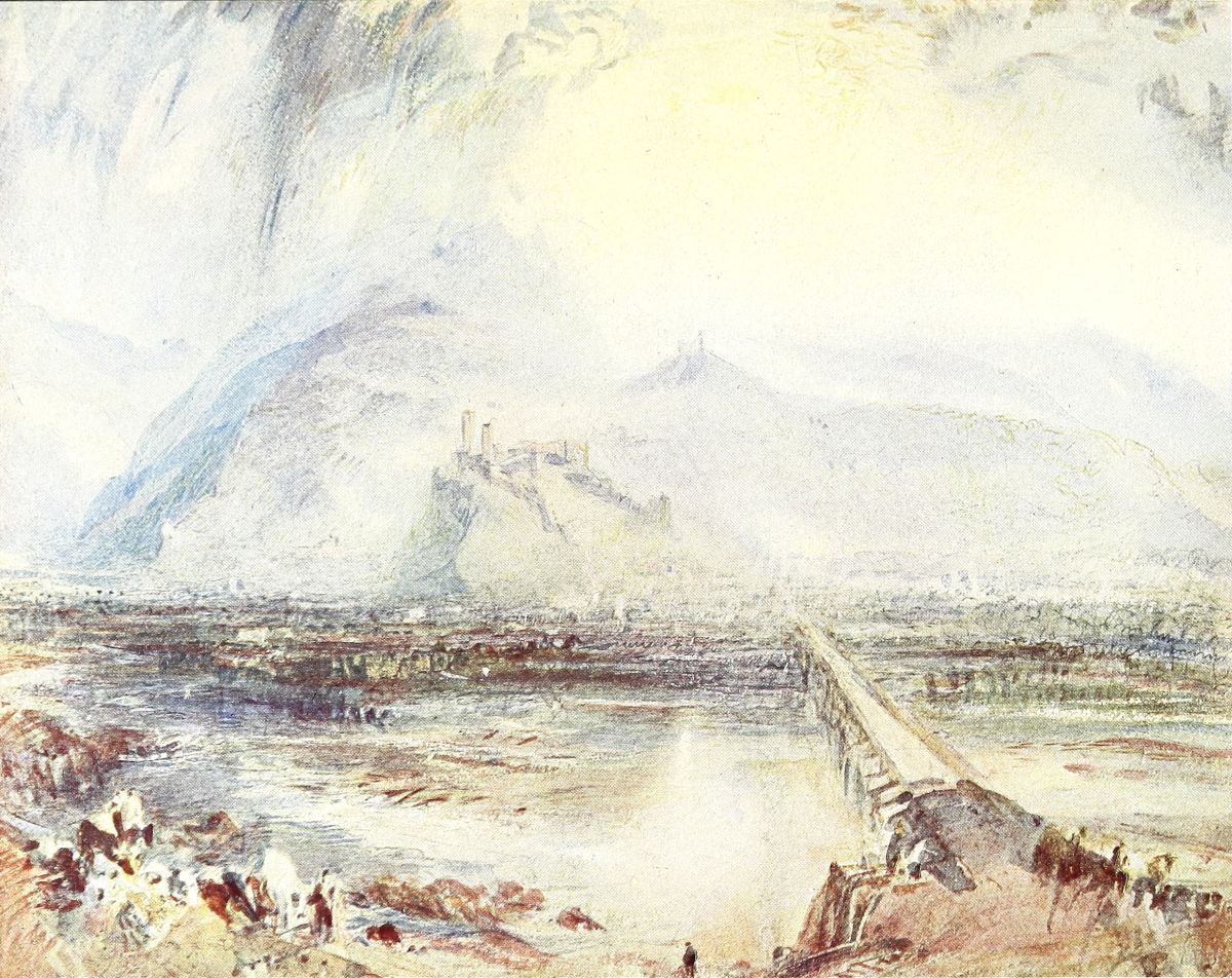 In 1802 Turner visited the Continent for the first time. He was naturally impressed with Calais, his first French town, and on his return he painted the well-known picture of Calais Pier (National Gallery), and the still magnificent but now much darkened Vintage at Mâcon (the Earl of Yarborough). But it was in Switzerland, Savoy and Piedmont that he spent most of his time, and the results may be seen in the fine drawings of Bonneville, Chamounix, and the Lake of Geneva in various collections, the Falls of the Reichenbach, the Glacier and Source of the Arveron, and others at Farnley, and the superb large body-colour sketches of The Devil’s Bridge and the St. Gothard Pass, in the portfolios of the National Gallery. Three of his Swiss drawings he sent to the Royal Academy Exhibition of 1803.