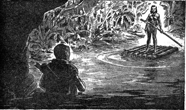 They saw her flailing away at a swarm of scaly black lizard things, young seven and eight foot-long drogs, with a leafy branch. She was safe enough from them as she sat in the crotch of a moss-hung jungle giant at the lake's green-scummed rim. But Ho Dyak saw the ripples that were converging on the girl from other portions of the pool, and he reached down to the weapons belted now about his dull-sheened space suit.