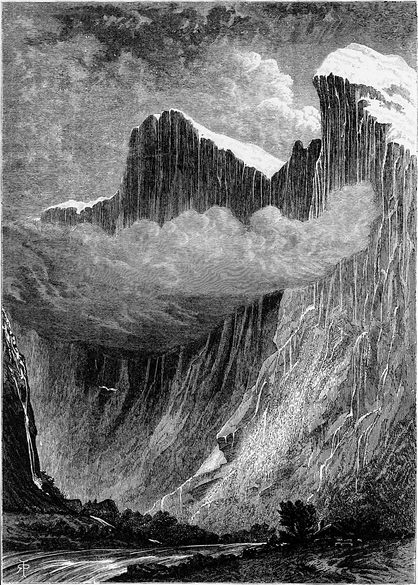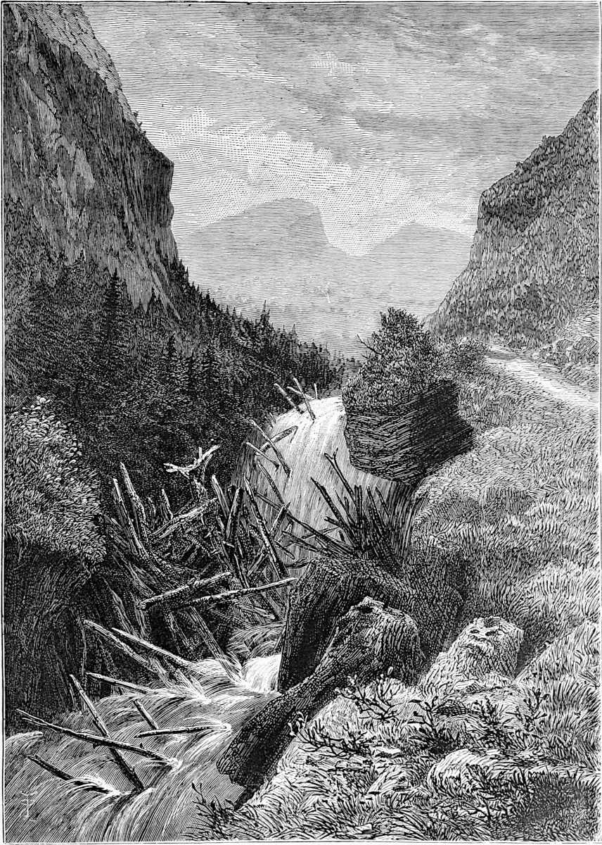 Between Christiania and Kongsberg much timber is seen wending its way down to the fjord. An instance of a timber jam after a shoot is given in the accompanying illustration. Sometimes trees are torn away at flood-time. The regular timber is duly marked and started, and at certain periods of the year persons follow the course of the river for the purpose of releasing the jams and helping the timber on its way to Drammen, where it is shipped for all parts of the world.
