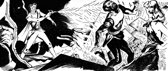 He moved forward, passing through the shattered bulkheads where open swinging doors gave acute evidence of the unexpectedness of the catastrophe which had overwhelmed the ship. Ruin and destruction were everywhere, but nowhere a trace of the bodies he knew had exploded into scarlet dust as the biting death of space lanced its deadly vacuum into the rending vessel. There could be only one answer, and it brought his gun into his hand as he moved warily through the corridors.