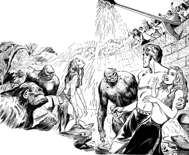 Once again, Winters watched the gathering of the beasts of Shanga. Hidden in the thicket, beyond the reach of the rays, he saw the hairy bodies rush and jostle toward the central clearing. He saw the shining of their drugged eyes. He heard them moan and whimper, and all over the garden the mouthing whisper went—Shanga! Shanga!