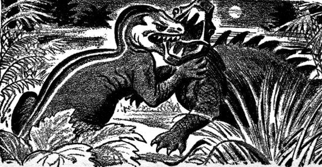 Threading his way between the brutish bodies, leaping over them, avoiding the touch of the scaly things, he came to the clump of flowering shrubs by the lake and crawled in among them.