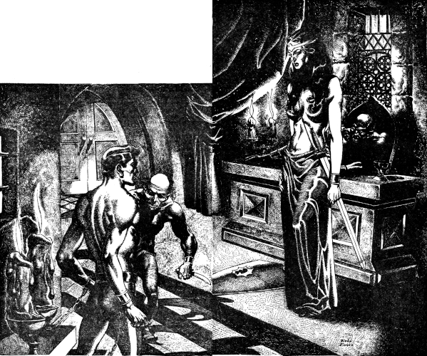 He was big, nearly seven feet, and muscled like a draft horse. But his body, naked above a gold-bossed leather kilt, was lithe and quick as a greyhound in spite of its weight. His face was square, strong-boned, weathered, and still young. It was a face that had laughed a lot once, and liked wine and pretty girls. It had forgotten those things now, except maybe the wine. It was drawn and cruel with pain, a look as of something in a cage. Starke had seen that look before, in the Luna blocks. There was a thick white scar across the man's forehead. Under it his blue eyes were sunken and dark behind half-closed lids. The man was blind.