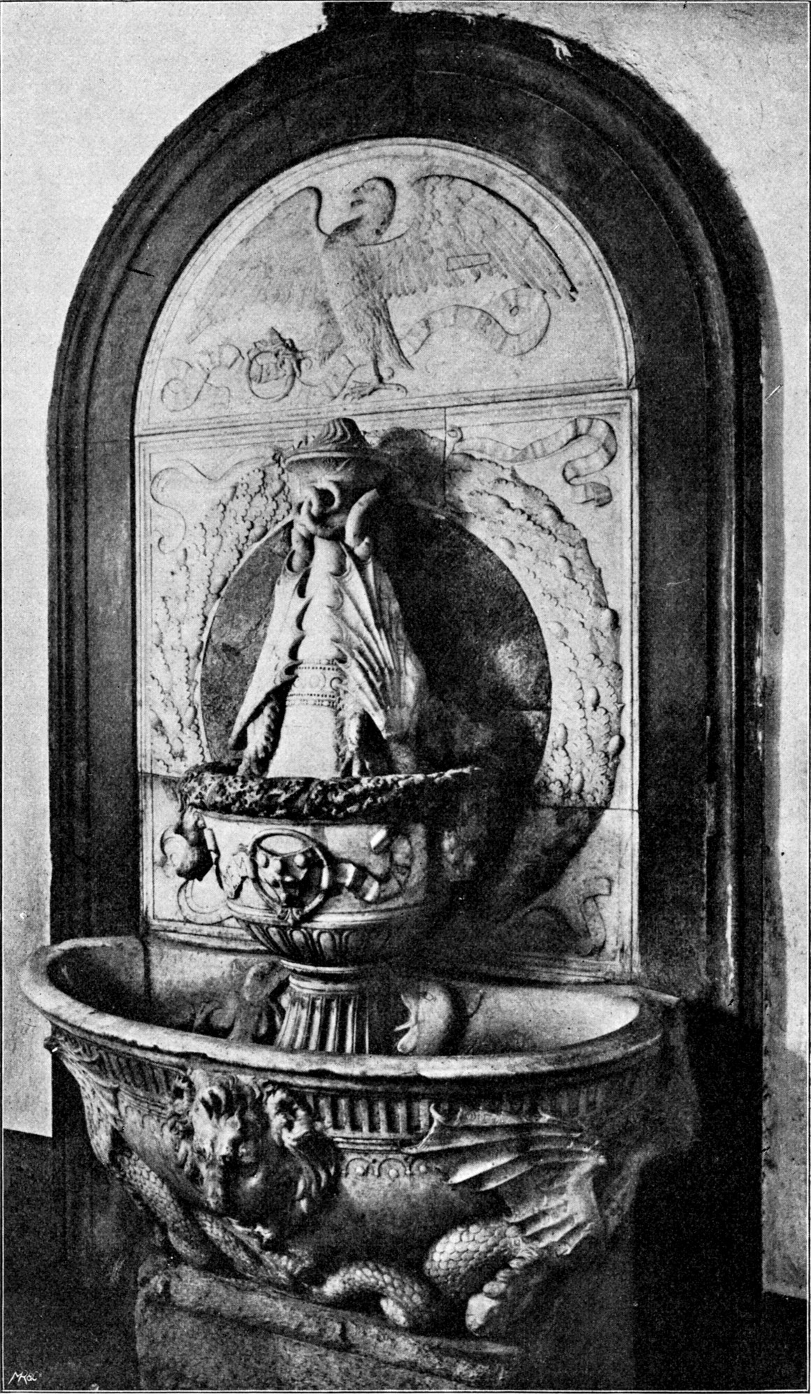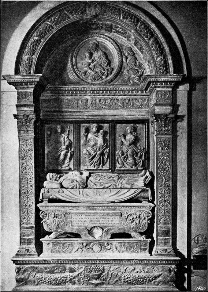 Genau so gering ist die Originalität des Francesco di Simone, dessen Spuren wir so oft im Werke des Verrocchio getroffen haben. Um ein geringes an Jahren jünger als Verrocchio hat Francesco nicht seine Lehrzeit in der Werkstatt Andreas durchgemacht. Sein Hauptwerk,[S. 99] das Marmorgrab des Rechtsgelehrten Tartagni in San Domenico zu Bologna (1477; Abb. 44), ist im Aufbau und in der Ornamentik von Desiderio abhängig, im Figürlichen und in der Faltengebung zeigt es das Vorbild des Verrocchio bis zur Unselbständigkeit und mit fast allen Fehlern, denen der übereifrige Nachahmer nie entgeht. Die Arbeit ist sauber und gewissenhaft bis zur Kleinlichkeit. Von Erfindung kann kaum gesprochen werden, und die ornamentale Überladenheit bekundet keinen feineren Geschmack. Dieselben Mängel beeinträchtigen auch die übrigen Arbeiten des Bildhauers, dessen Verbindung mit Verrocchio persönlich und künstlerisch lockerer gewesen ist als das Verhältnis zu Credi.