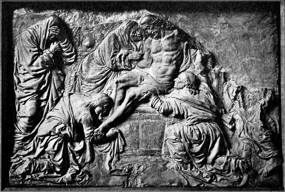 In den dargestellten Charakteren leben[S. 65] die Gestalten der beiden hervorragendsten Werke des Meisters, die ihn gleichzeitig mit diesem Relief beschäftigen, wie Nachklänge und Vorahnungen. Der Johanneskopf erscheint als eine leichte Modifikation des Christus, der teilnahmsvolle Jüngling wie ein Verwandter des Thomas aus der Gruppe an Or San Michele. In den zornigen Kriegern könnte man Studien zum Colleoni mutmaßen; hier wie dort müht sich der Meister um den Ausdruck wilder Größe.