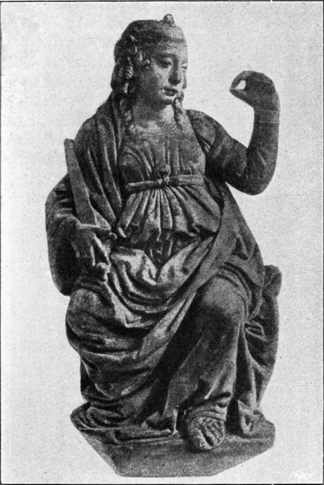 „Und David war ein Knabe bräunlicht und schön“, sagt die Bibel. So scheint er auch in der Phantasie Verrocchios gelebt zu haben. Im übrigen hielt sich der Meister nicht an die Tradition: jede Andeutung der Schleuder fehlt, und das Riesenschwert ist zu einer bescheidenen Waffe, für die Knabenhand passend geworden. Keck, sicher, leicht angeglüht von dem Feuer seines ersten Triumphes, blickt der Knabe lächelnd vor sich hin; die sehnige Rechte hält noch fest das Schwert am Griff, die Linke stützt sich in dem Gefühl fröhlichen Selbstbewußtseins leicht auf die Hüfte. Ein knapper Lederkoller umschließt den Leib, Ledergamaschen schützen Wade und Fuß bis zu den Zehen. Alle Ränder der Bekleidungsstücke sind ornamentiert; eine Palmette schmückt die Brust, Rosetten zeigen in gewissenhafter Anatomie[S. 22] die Stelle der Brustwarzen. Zwischen den Füßen liegt das wüste Haupt des erschlagenen Riesen, das mit seinem wirren Haar und den groben Formen den schwerlötigen Philister verrät. In der mitten auf der Stirn klaffenden Wunde saß ehemals noch der Stein fest.