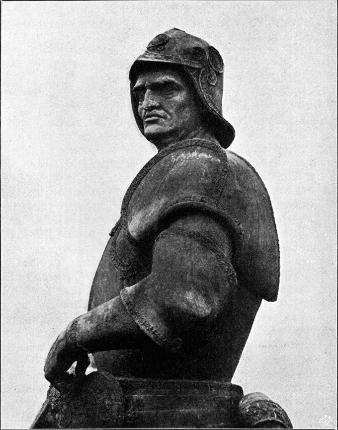 Mit der wie in einer Aufwallung kühnen Trotzes herausgedrehten linken Schulter, der der Kopf folgt, macht der Reiter die Bewegung des Rosses mit. Klar und frei überschneidet der Reiterkopf die Scheitelhöhe des Pferdes und dominiert ungezwungen über dem Ganzen. Eine Sturmhaube deckt das gewaltige Haupt mit den drohenden Augen. Die Entschiedenheit der Bewegung und die Macht des Blickes stehen schon auf der Höhe des neuen Stiles, der Kunst des Cinquecento. Im David, der übrigens auch das Motiv der herausgekehrten Schulter zeigt, in der Büste des Giuliano finden wir die Vorstufen zu dieser rücksichtslosen Größe der Bewegung. Aber neu und überraschend ist der Typus. Haben wir es mit einem Porträt des Colleoni zu thun?