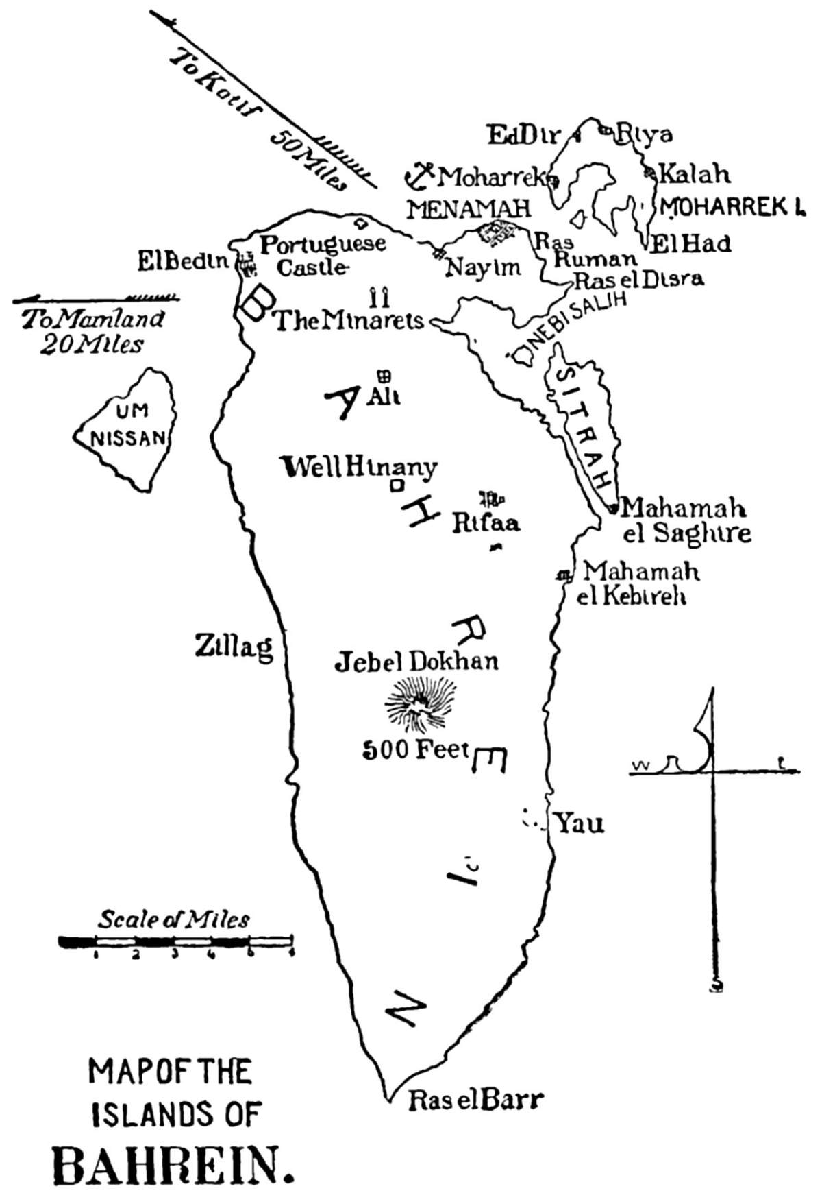 | Ancient history of Bahrein—Origin of name—Population—Menamah—The fresh-water springs—The pearl-fisheries—Superstitions about pearls—Value and export—Method of diving—Boats—Apparatus—Dangers to the divers—Mother-of-pearl—Other manufactures—Ruins at Ali—The climate—Political history—English protection. 9 | |