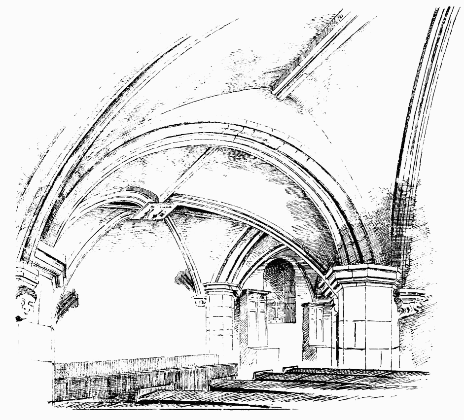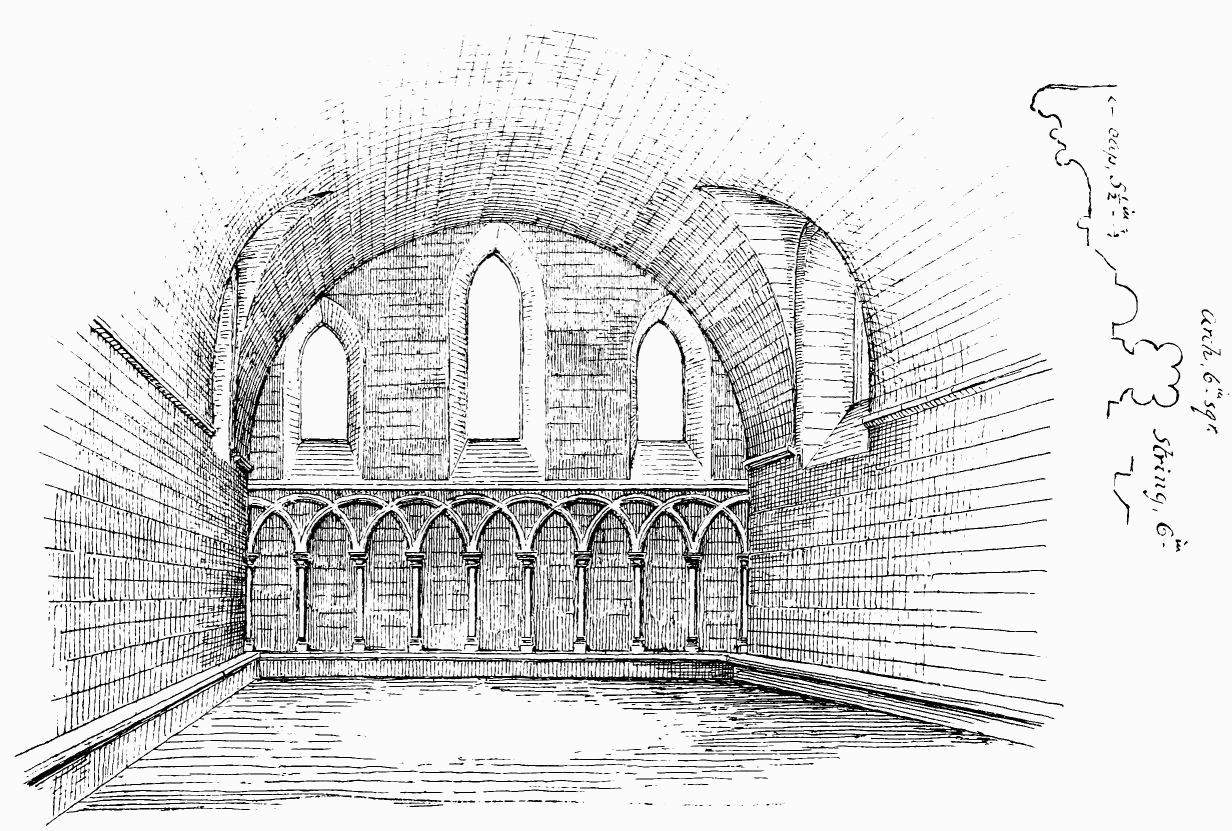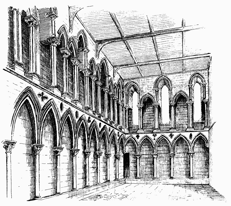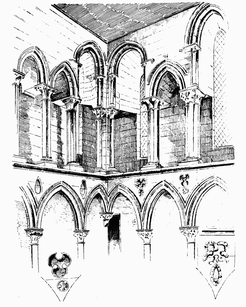 The plan consisted of an open court or cloister, sur{vii}rounded by a covered walk, having on one side (generally the north side) the nave of the church; while on the east side, in connection with the transept, lay the sacristy, chapter house, and frequently the fratery or day-room of the monks, on the upper floor of which range extended the dormitory, library, &c. The south side of the cloister was occupied by the refectory and kitchen; and the west side contained cellars and stores, and apartments for the lay brothers and guests.