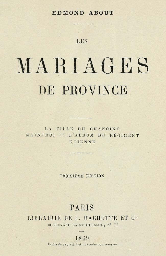 Les Mariages de Paris ont paru il y a douze ans sous les auspices de votre bonne et vénérée grand'mère, Mme Hachette ; je confie le destin des Mariages de Province à votre jeunesse dans sa fleur, comme les ouvriers attachent un bouquet sur la maison qu'ils ont bâtie. Il m'est doux d'attester ainsi une amitié que le temps et l'user ont affermie, et qui se transmet, comme un héritage croissant, d'une génération à l'autre. Quant au livre en lui-même, vous l'avez lu, je n'en dis rien : vaut-il mieux, vaut-il moins que les Mariages de Paris? C'est une question qui sera décidée dans vingt ans par mesdemoiselles vos filles.