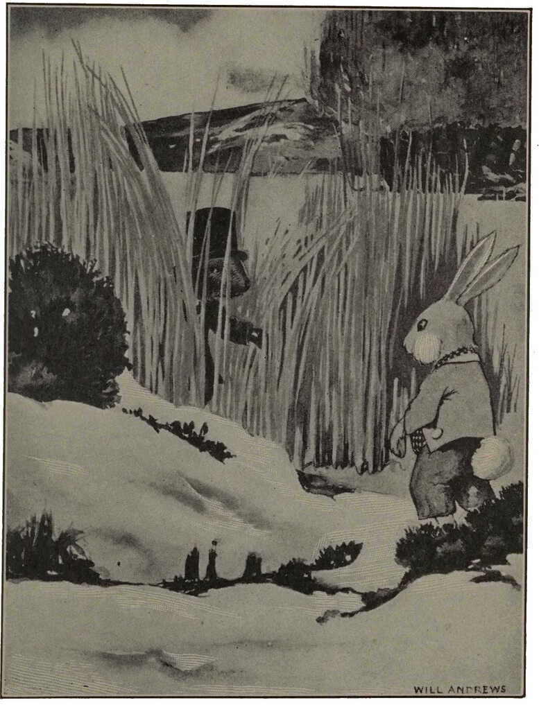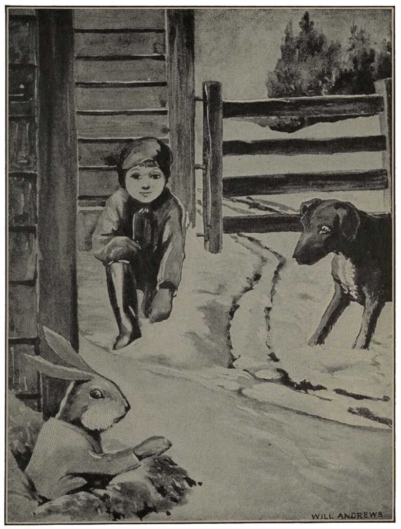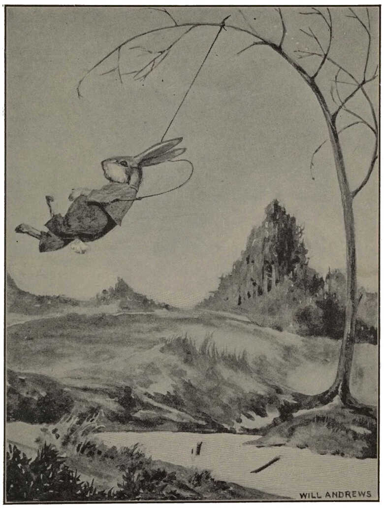 From way up there in the air he could see Tommy Peele turn around and hurry toward him, swinging his red mittens as he ran. And he knew Tommy had something to do with it. “This,” thought he, “is why Man is dangerous. How awfully slow he flies. Now he’ll eat me!” And the wire was squeezing him so dreadful, he didn’t much care. But Tommy just cut that terrible loop, and took the rabbit gently into his arms.