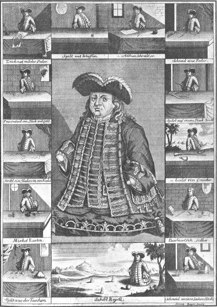 Minder ausführlich sind die Nachrichten über einen ungarischen Rumpfkünstler, »einen vielgereisten Mann, der ausser seiner Muttersprache noch Englisch, Holländisch, Deutsch und Französisch sprach, und in einem etwa ellenhohen Kasten stets auf dem Buckel einer andern Person transportirt wurde. Er hatte keine Beine und nur eine verkrüppelte Hand«. Seine Erscheinung wird bei seinem Auftreten in Regensburg im October 1719 folgendermassen beschrieben: »Von Gesicht und Leibe war er wohlgestaltet, hatte schwarzbraune lange Haare, und wenn er hinter dem Tische auf einem Sessel stund, so präsentirte er sich als ein sitzender wohlgewachsener Mann; von Leibe war er mager und geschmeidig. Seine Stimme war ziemlich klar (hell, hoch) und weibisch, sein Humeur immer lustig, er schlug die Trommel vollendet, spielte aus der Tasche mit grosser Behendigkeit trotz einem jeden Taschenspieler«. Sein Haupttric war der Handstand auf einer Hand während mehrerer Minuten. —
