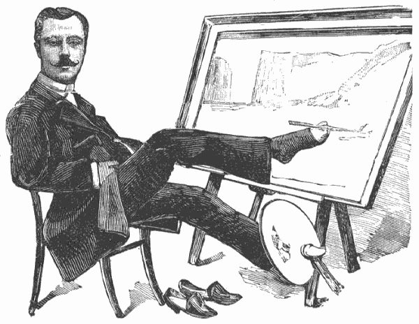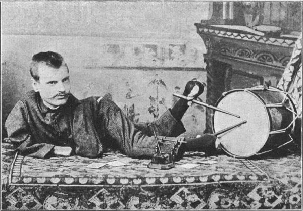 Einer der ersten Fusskünstler, die das Interesse auch der Aerzte erregten, dürfte wohl Gottfried Dietze gewesen sein, der, ohne Arme geboren, sich Ende der fünfziger Jahre unter den allerprimitivsten Verhältnissen in einer Leinwandbude auf den sächsischen Schützenfesten etc. producirte. Er war ein Mensch von achtzehn Jahren, der namentlich eine ganz eminente Fertigkeit in der Verwendung des Messers zum Auftrennen von Nähten, sowie in der Verwendung von Nadel und Zwirn zum Nähen entwickelte. Diese Leistung als »Flickschneider« aber culminirte in dem Einfädeln der Nadel, das mit einer unbeschreiblichen Gewandtheit und Sicherheit erfolgte. Nachdem er noch »Heil Dir im Siegerkranz« auf einer Ziehharmonika ziemlich geläufig gespielt hatte, zeichnete er zum Schluss seiner Vorstellung auf einem Quartblatt Schreibpapier mit Bleistift und colorirte mit Tuschfarben ein Blumen-Bouquet, unter das er dann mit Tinte: »Mit den Füssen gezeichnet und geschrieben von Gottfried Dietze« schrieb und das den Zuschauern gegen einen Obolus à discrétion offerirt wurde, der in seine Privat-Schatulle floss.