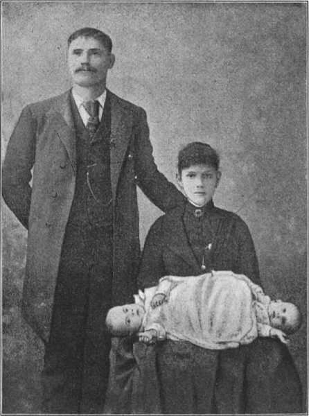 Das Bild lässt erkennen, dass Radica & Doodica — übrigens sonst gut entwickelte und körperlich gesunde Mädchen — durch eine Verwachsung der vorderen Rumpftheile mit einander verbunden sind. Das Ligament, welches sie verbindet, entspringt aus der unteren Spitze des Brustbeins. Die Blutgefässe communiciren nicht mit einander, Herzschlag, Pulsschlag und Athembewegung sind isolirt. Trotzdem ist die Verbindung sehr beweglich, denn gewisse, dem einen Kind gegebene Arzneien äussern auch bei dem andern ihre Wirkung, wenn auch in beschränkter Art, und das Nahrungsbedürfniss des einen Kindes soll durch die Ernährung des andern befriedigt werden. Diese grosse Beweglichkeit beweist, dass die Verwachsung nur die Schwertfortsätze und einige Rippenknorpel, sowie die Oberbauchgegend und gewisse Abschnitte des Magendarmkanals betreffen kann, also verhältnissmässig biegsame oder völlig weiche Theile. Damit sind ausser der Beweglichkeit die auf die Wirkungen der Arznei und die Befriedigung des Nahrungsbedürfnisses bezüglichen Punkte erklärt.