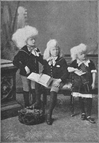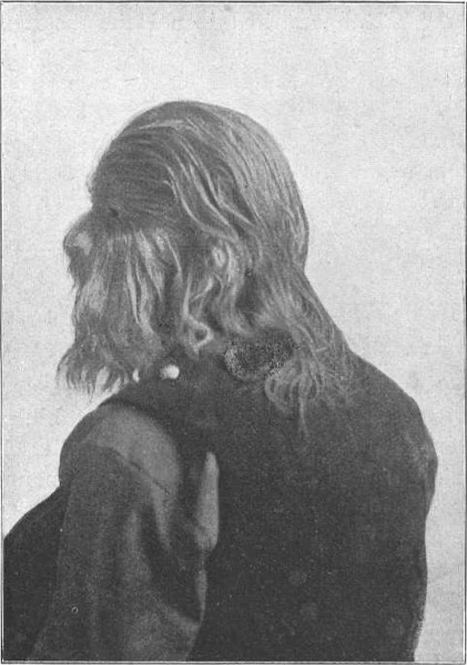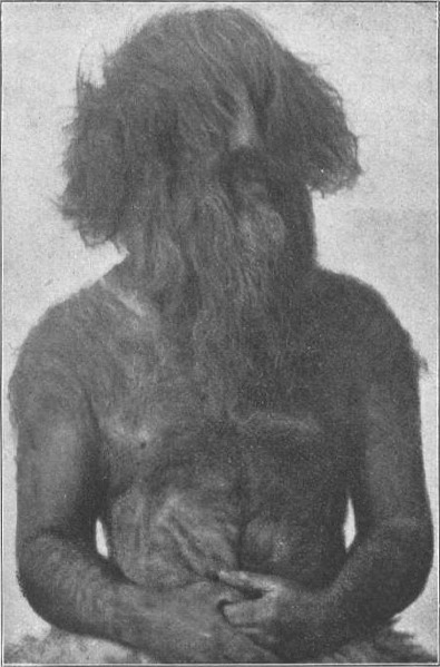 Schon bei seinem ersten öffentlichen Auftreten im Jahre 1886 wurde ihm von den Medicinern ein grosses[S. 79] Interesse entgegengebracht und sie erklärten ihn für einzig in seiner Art dastehend. Eine Menge schneeweisser Haare nämlich wächst wie ein offener Sonnenschirm von sechs Fuss Umfang auf seinem Kopfe. Es ist elastisch, kraus, elektrisch und wächst so üppig, dass es dem Kamms Widerstand leistet und nur mit Bürsten bearbeitet werden kann, und damit es nicht zu lang wird, alle vier bis sechs Wochen gestutzt, um nicht zu sagen geschnitten werden muss.