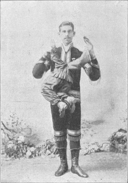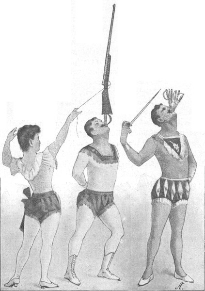 darf unbestritten als der Beste seines Genres bezeichnet werden. Er entstammt einer alten französischen Adelsfamilie und ist in Französisch-Canada in Amerika geboren. Schon als Knabe verliess er seine Heimath und schloss sich einem fahrenden Circus an. In Buenos-Ayres machte er die Bekanntschaft eines Schwertverschlingers, der ihn jedoch trotz allen Bittens in die Mysterien dieser Kunst nicht einweihen wollte. Der junge Kunst-Novize liess sich dadurch aber nicht entmuthigen, begann seine Exercitien ohne An[S. 82]leitung mit einem Stückchen Silberdraht und brachte es durch Ausdauer bald dahin, dass er sich öffentlich produciren konnte, und heute ist er der Beste seines Genres nicht nur in Amerika, sondern auch in Europa. Vor kurzem producirte er sich auch mit ganz ungewöhnlichem Erfolge im Circus Ciniselli in St. Petersburg und bringt eine der dortigen deutschen Zeitungen einen ziemlich eingehenden Bericht über seine Leistungen, der im Nachstehenden in seinen Hauptmomenten reproducirt ist: