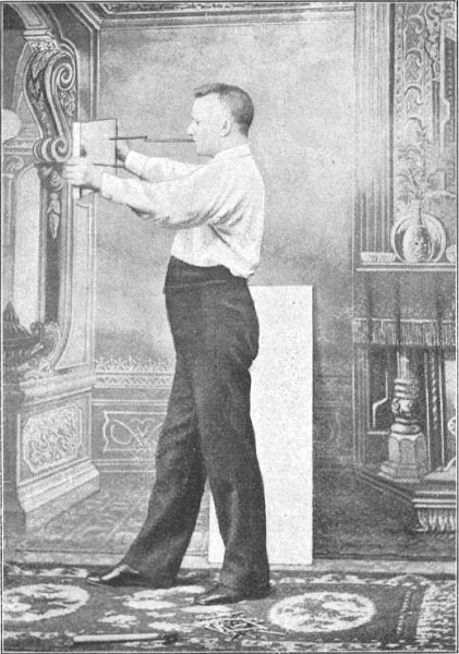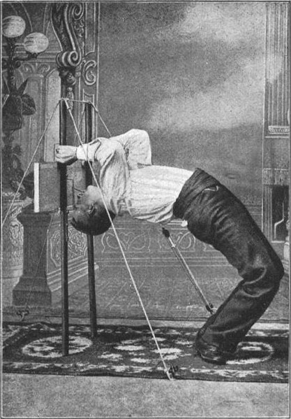 ist keine Abnormität im eigentlichsten Sinne, unter den »Zahn-Athleten« aber ist er unbestritten eine solche, denn er hat ein Gebiss, wie aus bestem Stahl gefertigt. Er nimmt z. B. zwei bis drei Zoll lange Nägel zwischen die Zähne und stösst sie mit diesen durch aufeinanderliegende ein bis zwei Zoll dicke Bretter, die er auf diese etwas ungewöhnliche Weise zusammennagelt; die Nägel zieht er aber auch unter den verschiedensten Stellungen des Körpers wieder mit den Zähnen, die ihm dabei als Zange dienen, heraus. Sein Haupt-Tric aber ist folgender: Er schlägt mit einem Hammer eine etwa zwei Zoll lange, dicke Holzschraube durch ein einzölliges Brett, befestigt dieses dann in einem für diesen Zweck eingerichtetes Gestell, und, den[S. 60] Körper rückwärts überbiegend — siehe das Cliché — zieht er die Schraube mit den Zähnen wieder aus dem Brett heraus. Es ist dies eine geradezu phänomenale Kraftleistung, und offerirt Le Roy demjenigen 500 Dollar, der die Schraube mit einer Zange herauszieht, was bisher jedoch noch Niemandem gelungen ist.