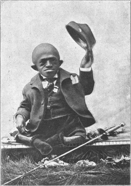 Er ist, wie das Cliché zeigt, ein Zwerg, jedoch so verkrüppelt, dass er von Kindheit an weder stehen, noch gehen, sondern sich nur kriechend, allerdings mit unglaublicher Schnelligkeit und Gewandtheit, vorwärts bewegen konnte. Trotzdem erfreut er sich der besten Gesundheit und eines wahrhaft übersprudelnden kaustischen Humors, dem er auch als incarnirter Politiker ungenirt die Zügel schiessen lässt; werden staatliche Institutionen discutirt — dann schont er den Präsidenten der Vereinigten Staaten ebensowenig, wie den untergeordnetsten Communalbeamten mit seinen satyrischen Witzeleien.