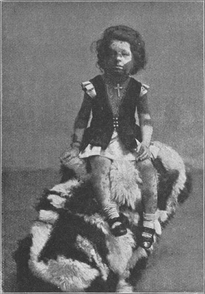 In der Völkergeschichte begegnen wir ähnlichen Typen haarreicher Volksstämme, so den Ainos und neuerdings den zottigen Menschen im Innern von Siam und Anam. Auch an einzelnen interessanten Individuen — es sei nur an den pinscherartigen Russen Adrian Jestichew und an die kleine Kra-o erinnert — sind solche Formen abnormer Behaarung zu beobachten gewesen; indessen als ein Naturwunder eigenster Art tritt Marietta, das »gescheckte Mädchen«, in Erscheinung, denn bei ihr offenbart sich eine ganz merkwürdige Haarbildung, die in dieser Weise noch nirgends beobachtet worden ist. Marietta stammt, wie es bei den sogenannten »Haarmenschen« nachzuweisen ist, weder von einem wilden Naturvolke, noch von einer farbigen Race ab, sondern sie ist von europäischer Herkunft. Sie erinnert bald an den Leoparden, bald an das Zebra oder an den Affen, je nach der Art der Zeichnung, Färbung und Behaarung der einzelnen Körpertheile. Höchst unregelmässig hat hier die Natur gearbeitet, eigentlich ganz systemlos einen atavistischen Rückfall bezeichnend. Das Gesicht[S. 87] Marietta's ist auf der rechten Seite vollständig schwarz gezeichnet und zum grössten Theil behaart, auf der linken Wange dagegen nur mit einem Backenbart bedeckt. Auch das Kinn weist einen ziemlich stark entwickelten Bart auf. Am auffallendsten ist die Verfärbung und die zottige Behaarung des glänzenden Rückenfells. Seine Haare erreichen eine Länge von über 2 Centimeter, während die Haare des Bartes eine solche über 6 Centimeter, des Unterarmes eine solche über 3 Centimeter aufweisen. Entgegen den Haaren des Rumpfes, der Arme und Oberschenkel, die nach unten gerichtet sind, streben die Haare der Unterschenkel nach oben, wie die der Unterarme der Anthropomorphen oder Menschenaffen. Der übrige Körper des »scheckigen Mädchens« trägt ein Gemisch von Streifen und Flecken, bald dichter, bald dünner mit Haaren besetzt. Dabei treten überall merkwürdige Gegensätze hervor. So ist z. B. bei[S. 88] Marietta von den zehn Fingern nur einer schwarz; das eine Ohr schwarz, das andere dagegen weiss. Das braune Colorit der Beine contrastirt merkwürdig mit der tiefschwarzen Färbung des Kopfes.