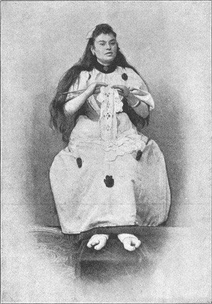 die das Cliché zeigt, ist eine hübsche Französin von etwa zwanzig Jahren, aber ein bedauernswerthes Geschöpf, denn ihre Hände und Füsse haben mehr Aehnlichkeit mit Krebsscheeren, wie mit menschlichen Gliedmaassen. Die Hände sind bis zum Handgelenk gespalten und von den Fingern sind nicht einmal Rudimente vorhanden; die Füsse dagegen sind weniger verkrüppelt.