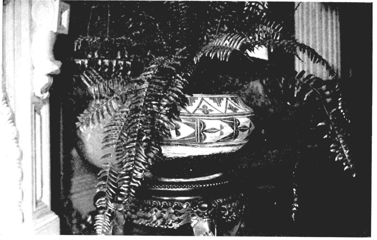 A study of the range of shapes and designs in Indian pottery is a revelation to many who have thought of the Indian as an ignorant savage. Aside from its beauty and decorative value, the uses to which Indian pottery can be put in our homes are many. The great bowl shown in the plate suggests one delightful way of utilising this ware. Foliage plants of any size, from a tiny cactus, which seems to find a bowl with a rounded base the most comfortable of abiding places, to a great spreading fern, harmonise with the Indian colours. So will flowering plants, except those which have red, pink, or purple blossoms; and what a relief these plant-bowls are to the eye after some of the jardinières one sees!