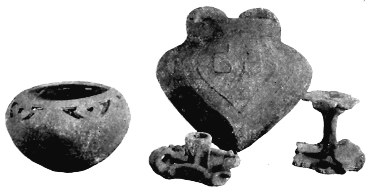 The clay used at first was such as could be found almost anywhere near the surface, and consequently was full of impurities. Later, however, clean clays were much sought after, and no pains were spared to grind and work them into good condition. This was done with the feet or hands, or both. As the craft advanced, potters began to temper their clay with other ingredients, according to the use to which the vessel was to be put. For instance, the clay for toys and the smaller vessels needed no tempering. Pipes were made of such clay, or of one tempered with a finely ground substance, while cooking-pots and cauldrons, which were subjected to constant heat, were made of clay containing a large amount of coarser tempering ingredients. Some of the tempering agents were rock, sand, pulverised shell, bits of baked pottery, cinders, ashes of bark, and even raw vegetal materials. The heat at which the pieces were fired was rarely strong enough to change any of the mineral substances in the clay.