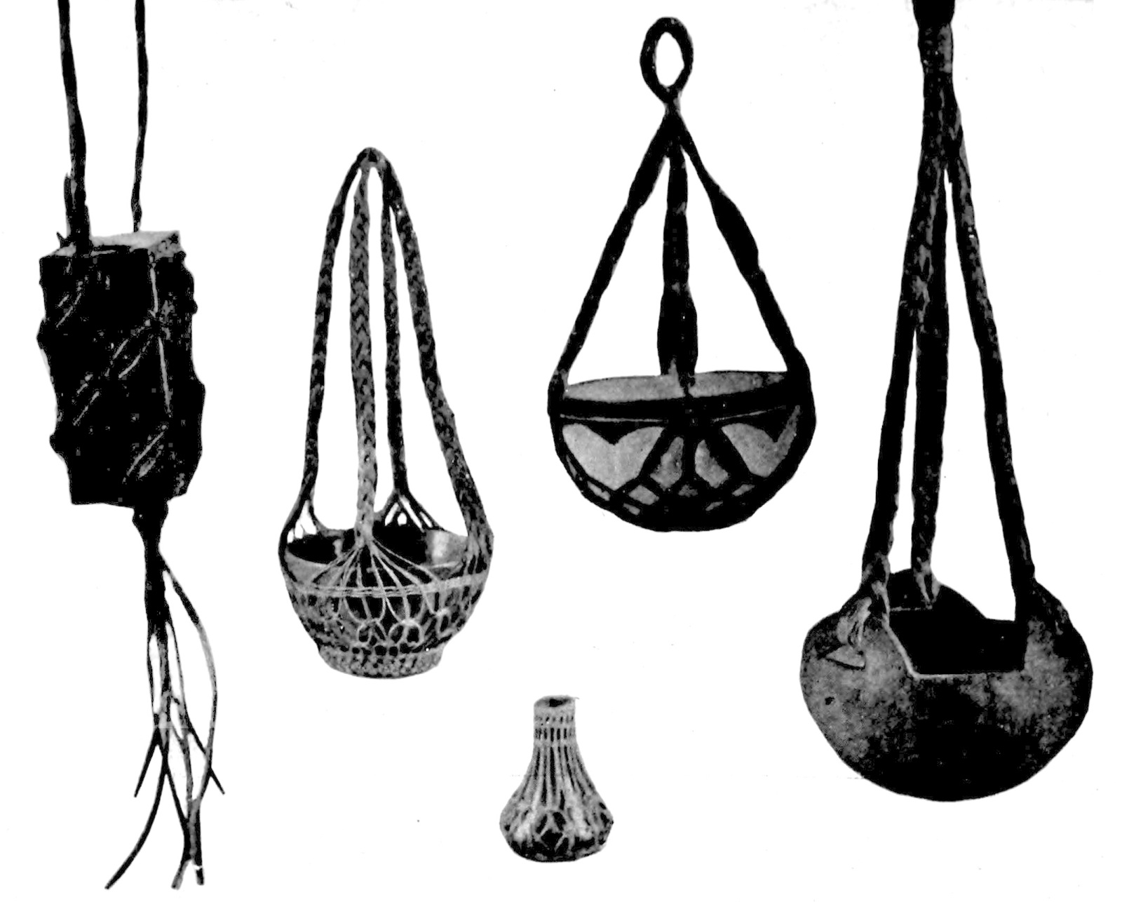 The two crafts have helped each other from that day to this. The Indian woman suspends her earthen cooking-jar with coils of wild grapevine, which ever and anon she smears with wet clay when the flames come too near. Japanese craftsmen enmesh their pottery jars with wistaria stems to126 protect them from breakage, or to suspend them against the wall, where growing plants or trailing vines may fill them to overflowing. Even the little ginger jar one buys for a few cents in Chinatown has its case and handle of pliant cane.