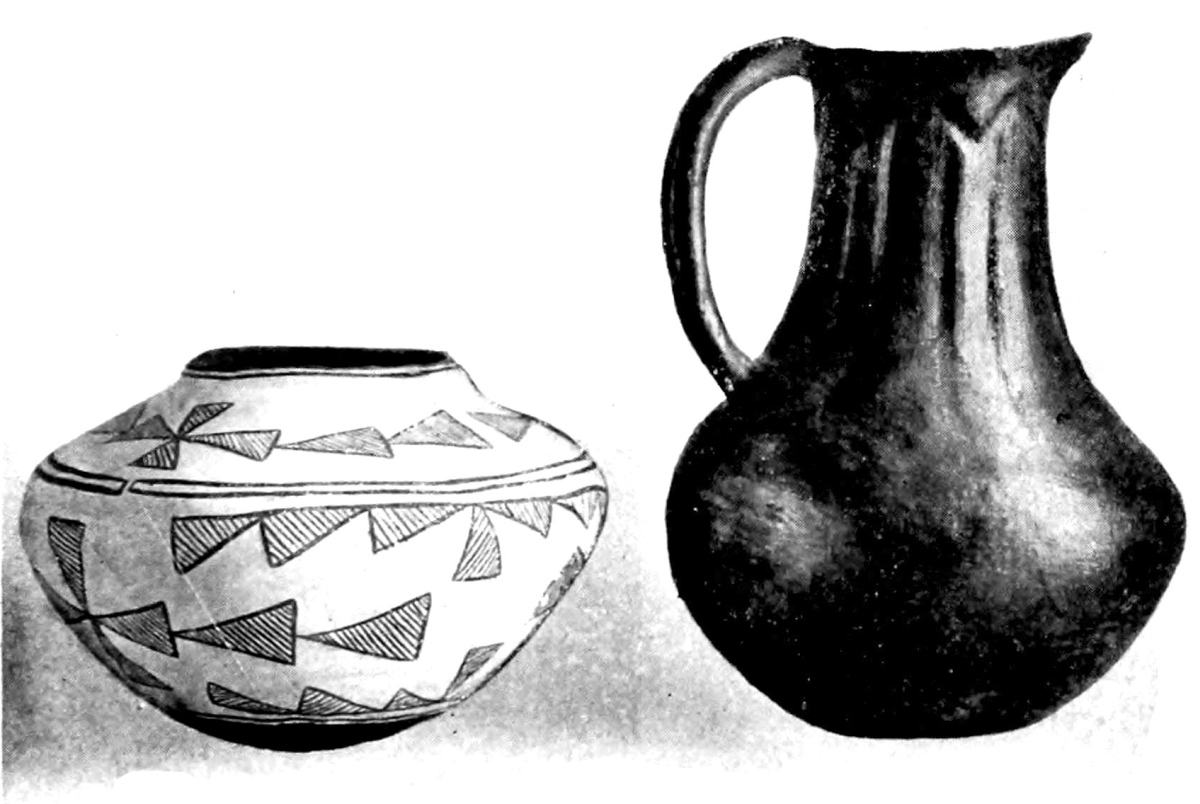 The black pitcher on the right is of Santa Clara ware. Beside it is a water-cooler or tenaja made by a Zuñi.]