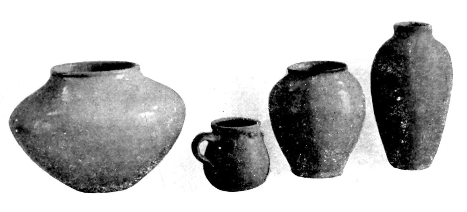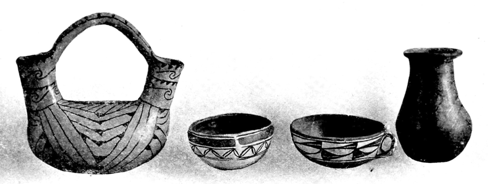 The pottery of different sections of the country varies in material, form, colour, and decoration. That the ware of a certain tribe was crude and im151perfect does not necessarily indicate that the people who made it were inferior in culture, but that the natural conditions were not favourable to pottery-making. A tribe living near clay-beds would as naturally make good pottery as one around whose homes materials for basket-making grew in abundance would excel in that craft. Perhaps, on the whole, the pottery of the South is more advanced than that of the Northern tribes, probably because of the difference in climate. While the people of the North were wandering hunters for the most part, those of the South were more prosperous and stay-at-home, and would be likely to have more wants than the Northern tribes, with leisure to gratify them.