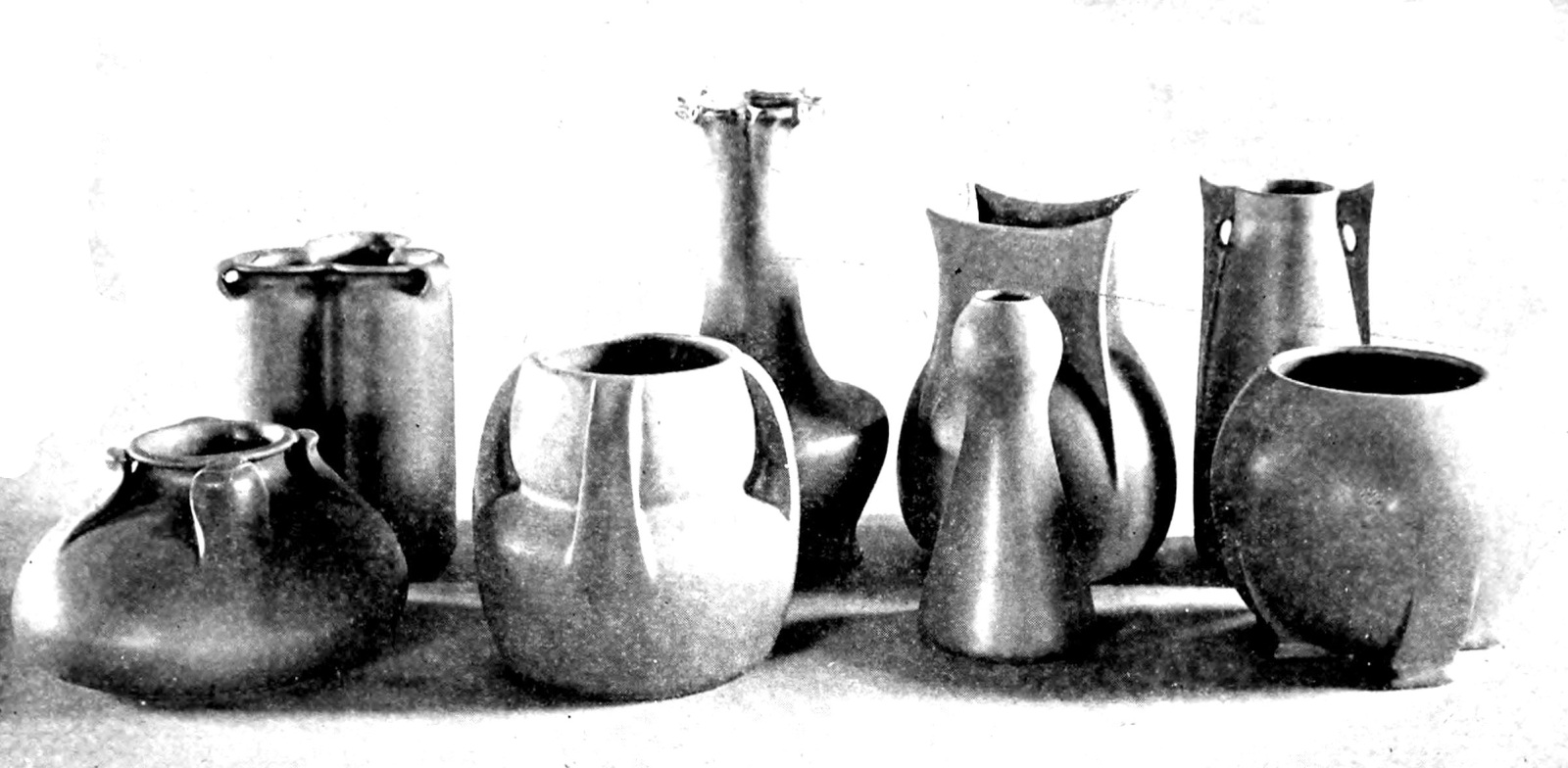 The work of the Brush Guild of New York is more like Indian pottery than any other of the American wares. The pieces all have a hand-moulded look, and the few designs are quite primitive in their simplicity. The glossy-black finish suggests Indian smother-firing. It is not unlike the black pottery which the Santa Clara Indians make, and the great generous pieces are also suggestive of this ware. Unlike any Indian pottery, however, the bowls and jars of the Brush Guild will hold water perfectly.
