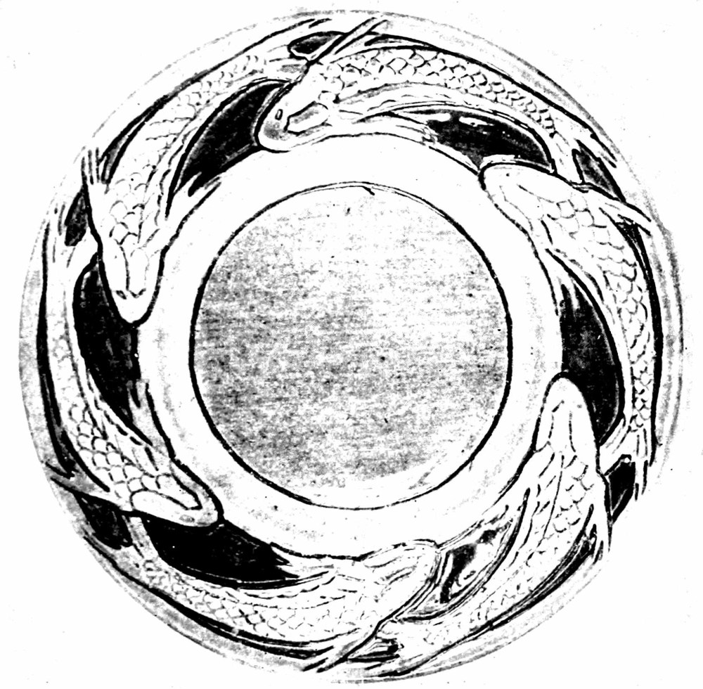 From the far South comes an exceedingly interesting ware: this is the Newcomb pottery, made by the students of Newcomb College, New Orleans. It may be seen at exhibitions of arts and crafts guilds here in the North. The ware originated in the art department of Newcomb College. Here, for years, teachers of drawing and painting had been educated, but it began to be manifest that, with the lack of other fields for art workers, this department could not be widely useful.178 The establishment of a pottery was the practical solution of this difficulty. Many young women have found, in the making of this pottery, an artistic vocation from which they reap profit and reputation. The aim of the originators from the first has been to make a ware that would be individual—one that should have a charm all its own. This has been accomplished by taking as motives for the designs the unusual and beautiful Southern flowers, plants, and trees, as well as the animal life of that part of the country. A charming pitcher has a design of snow-drops, painted in cream-white slip on a yellow-gray background. Another piece has a decoration of fishes, and on still another, a high, slender flower-jar, stalks of the sugar-cane form the design.
