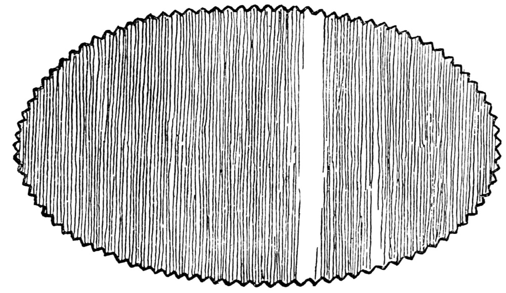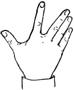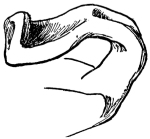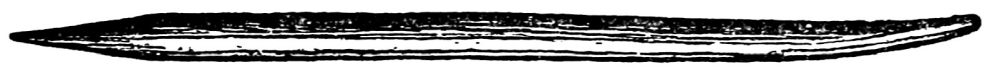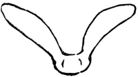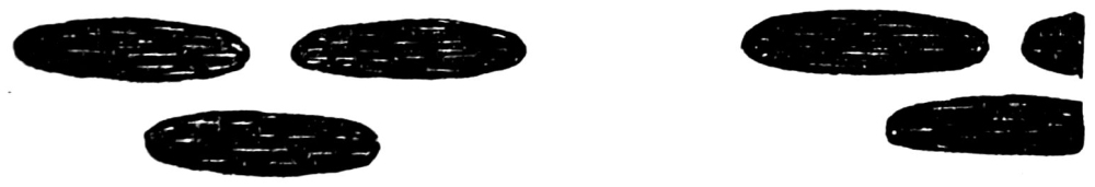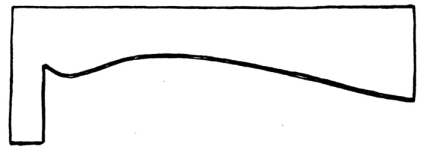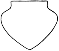 Three handles are cut from a flat piece of clay about three inches wide by sixteen long and half an inch thick, in the shape shown in Fig. 52, and attached as follows: The circumference of the top of the bowl is divided into thirds and marked with a tool or pencil. It is then an easy matter to place the handles so that the centre of each shall be just above one of the marks on the top edge. At the points where the handles are to be attached, the145 top of the bowl is criss-crossed with the pointed steel tool and wet with slip. The handles are then placed in position, and their edges worked closely against the top and sides of the bowl with the flat of the nail. They should be curved in a little to follow the lines of the bowl (see Plate).