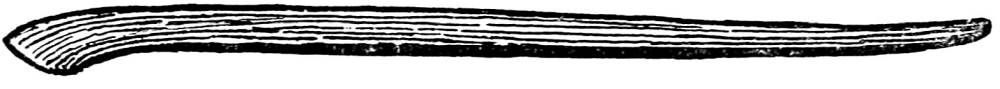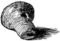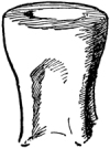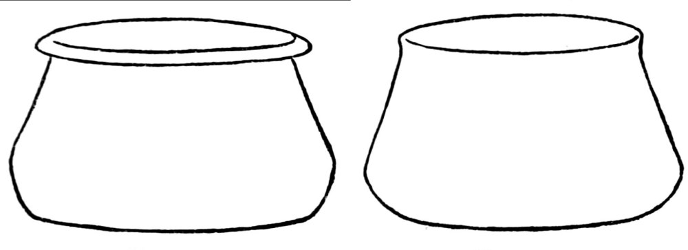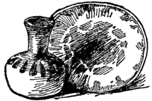 As to the uses to which the Indians put their152 pottery; most of the pieces show with simple straightforwardness what purposes they served. In only a few cases is there any doubt—notably some spool-shaped articles of clay, found in the Ohio Valley. At first, pottery was chiefly used for the storing, cooking, and carrying of water and food; taking the place, in some degree, of vessels of wicker, horn, and stone. This has always remained its most important function. Earthen vessels were employed in religious and other ceremonies, and earthen tools were often made, while there are, besides the myriads of pipes, a host of small clay vessels and figures which were evidently toys or used in games (See Figs. 53 and 54). It is interesting to note the difference between our cooking-pots and those of this primitive people. Theirs have almost invariably a round or cone-shaped base (See Fig. 55), which Prof. W. H. Holmes explains was natural, as, among barbarous nations, hard, level floors were the exception, while those of sand and soft earth were the rule. Under those conditions, the153 rounded base would be much the best. In putting the pot over the fire, the fuel or other supports kept it in position. Often cooking-vessels were made with short, strong handles (See Fig. 56) or a flaring rim, so that they could be conveniently swung over the fire with vines or cords. In certain parts of the country where the Indians made salt by evaporating the water from saline springs, large vat-shaped vessels of clay are found which were evidently moulded for the purpose. They are peculiar because of their size and the great thickness of the walls, while almost invariably they have, on the outer surface, markings which seem to have been impressed with a woven fabric.
