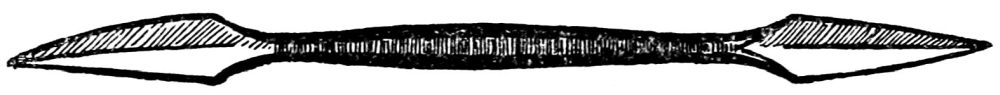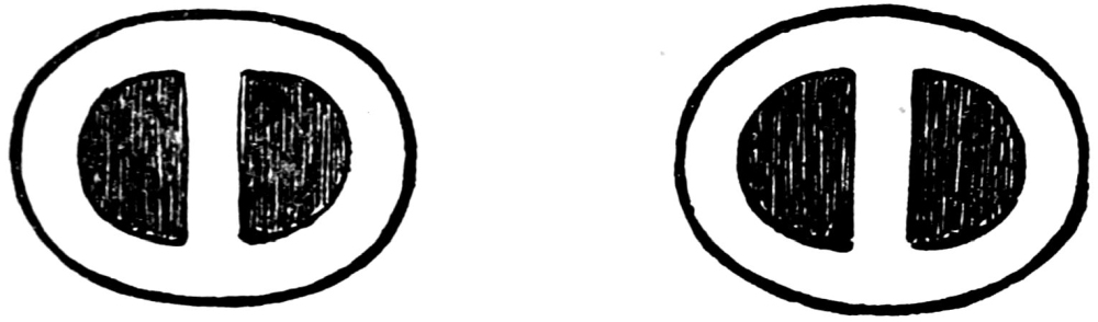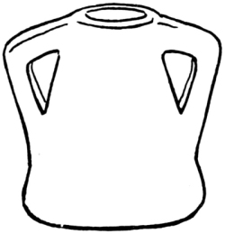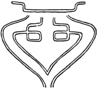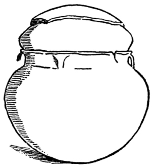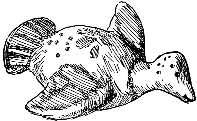 As burial urns, pottery bowls and vases were often made use of. Not so often, however, for holding the ashes of the dead as for the skull and other bones, which were crowded into a single jar, or bowl, such as was common in the household. This was covered with a smaller vessel (see Fig. 59). Sometimes several of these bowls surrounded and covered the bones. Occasionally, an earthen casket seems to have been made especially for the155 purpose. There have been found, beside these burial vessels in the Indian graves, smaller receptacles for food, and even rude toys. The latter were usually animal forms—figurines, images of fish, turtles, and birds. It is surmised that these were offerings made with the expectation of their being of service to the dead in a future life.