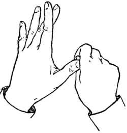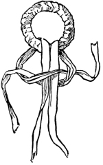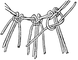 Finish off the end of the raffia by sewing several stitches through and through the ring. Pin this ring to a cushion on one’s lap or to some firm, soft object near at hand. Take two strands of raffia, double them around the ring, and with the four ends thus made tie a Solomon’s knot as follows: Hold the two upper strands straight and taut. Bend the under strand on the left across them to the right (see Fig. 47), and bring the under strand on the right over the end of the left strand, back of the middle strands, and through the loop made by the left strand in starting. Another pair of strands is knotted on in the same way, and another, until there are thirteen groups around the ring. Beginning anywhere on the ring, the128 strands on the right of a group are brought beside the two on the left of the group to the right of it, and the middle pair of the four are held straight down, while the strands on the right and left are knotted upon them as already described. This knot should be about half an inch from those in the previous row. Make a double knot this time—that is, repeat the process already described. Take the strand which was on the left after the first knot was tied, bring it over the middle strands to the right, and after bringing the strand on the right over the end of the left one and back of the middle strands, pass it up through the loop made by the left strand in starting. The two strands at the right of the right-hand group are next knotted in the same way with two on the left of the next group to the right, and so it goes on around the net—making a double Solomon’s knot each time.