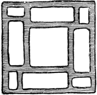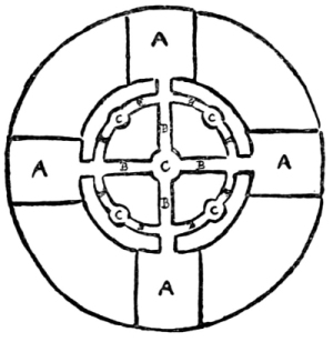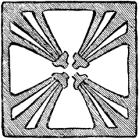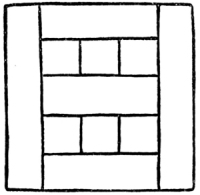 Just a word about the saggers. These huge, rough boxes of burnt fire-clay, whose office has already been spoken of, are sometimes bottomless, simply rings. Should a sagger be too low to contain a piece that is placed in it (as is often the case), one can build up the clay-box to the required height with the bottomless saggers. Between every two saggers rolls of clay are laid (coiled around the edge) to hold them together. When the kiln is filled at last with its stacks of saggers, the doorway119 is bricked up and the fire started. The open-fire kiln requires the best part of three days to complete it. The first day it is filled with pottery and the fire started. In firing a kiln, the heat should be raised very slowly. All that night the fire is watched and fed, as it must be kept at the requisite temperature, for if it gets low, or, as the potters say, “slips,” the glaze is spoiled and the pottery must all be reglazed and fired again. The weather affects the kiln, the draught not being so good on a damp or rainy day as on a fair one; and the coal also must be specially chosen for the kiln. It takes several tons to fire one kiln, so that the success or failure of a firing is no light matter. The second day much attention must be given to keeping the fire up, and at about nightfall the guides are drawn as follows: